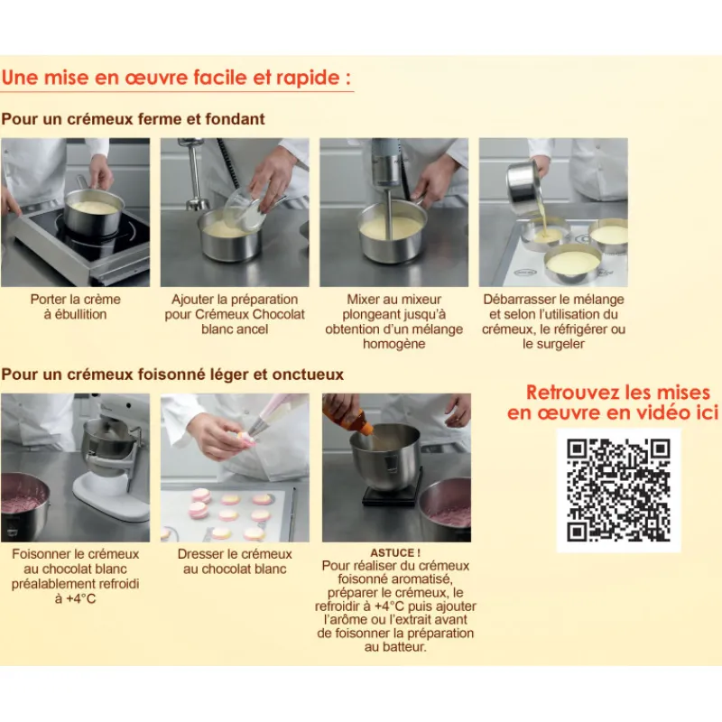 Que ce soit pour un crémeux ferme et fondant ou plutôt un crémeux foisonné léger et onctueux, le crémeux chocolat blanc 1kg Ancel sera la solution rapide, pratique et 100% gourmande !