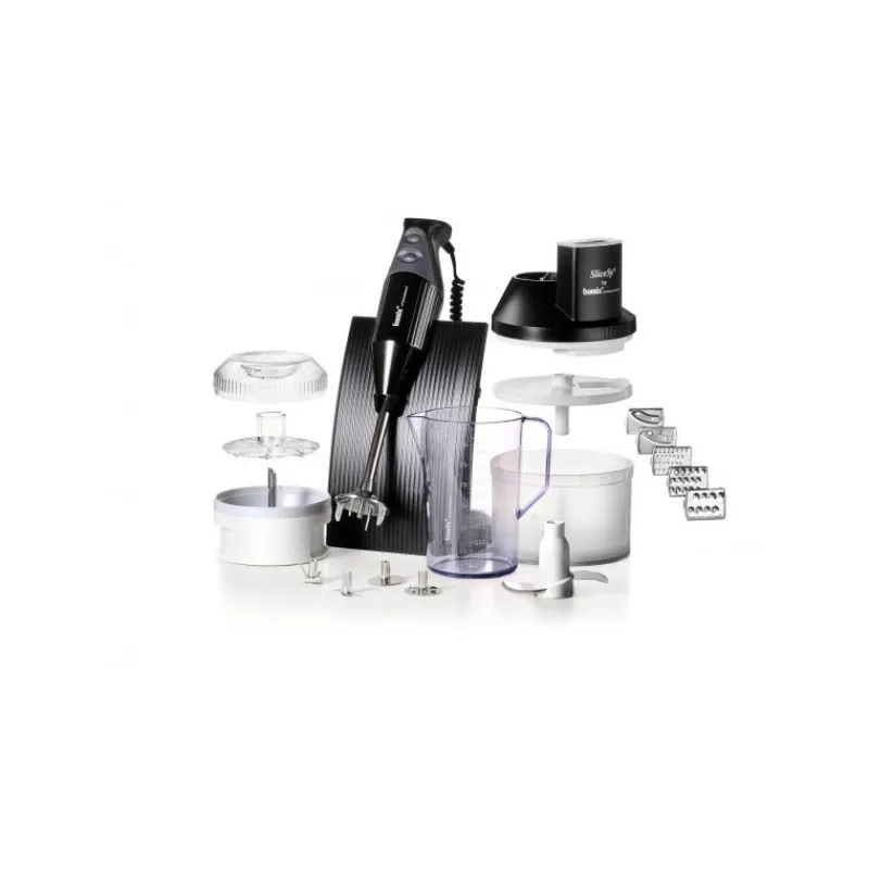 - Conditionnement : 1 Mixeur Plongeant Bamix M200 SwissLine noir, 4 disques (hachoir, fouet, étoile et mélangeur), 1 SliceSy noir (comprenant 1 couteau hachoir, 1 insert râpe julienne fine, 1 insert râpe julienne moyenne, 1 insert râpe julienne épaisse, 1 insert éminceur lamelles fines, 1 insert éminceur lamelles épaisses, 1 poussoir, 1 porte-disques et 1 bol), 1 support sur pied noir, 1 cordon spirale noir, 1 processeur de 200 ml, 1 disque poudre, 1 cruche de 1L et 1 livret de recettes.