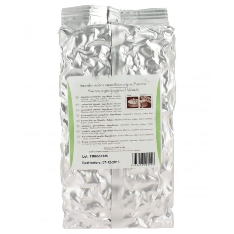 Ingrédients : Amandes Marcona, sucre. Peut contenir : sésame, autres fruits à coques, noix.