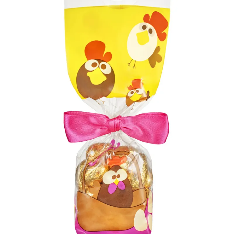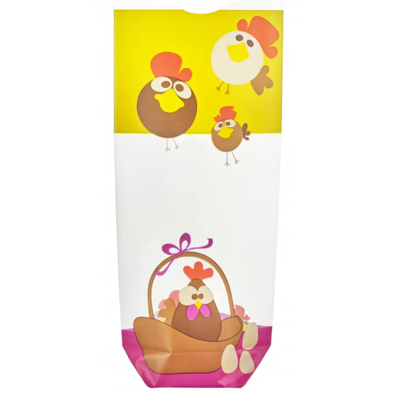 Le sachet avec fond Cocotte arbore de part et d’autres de jolies poulettes de Pâques. A moitié transparent, le sachet avec fond cocotte laisse deviner son contenu, pour mettre l’eau à la bouche ! Grâce au fond en carton doré, le sachet se tient immobile et droit. De cette manière, vous pourrez le remplir facilement et rapidement, et gagner en espace de rangement en cas de transport.