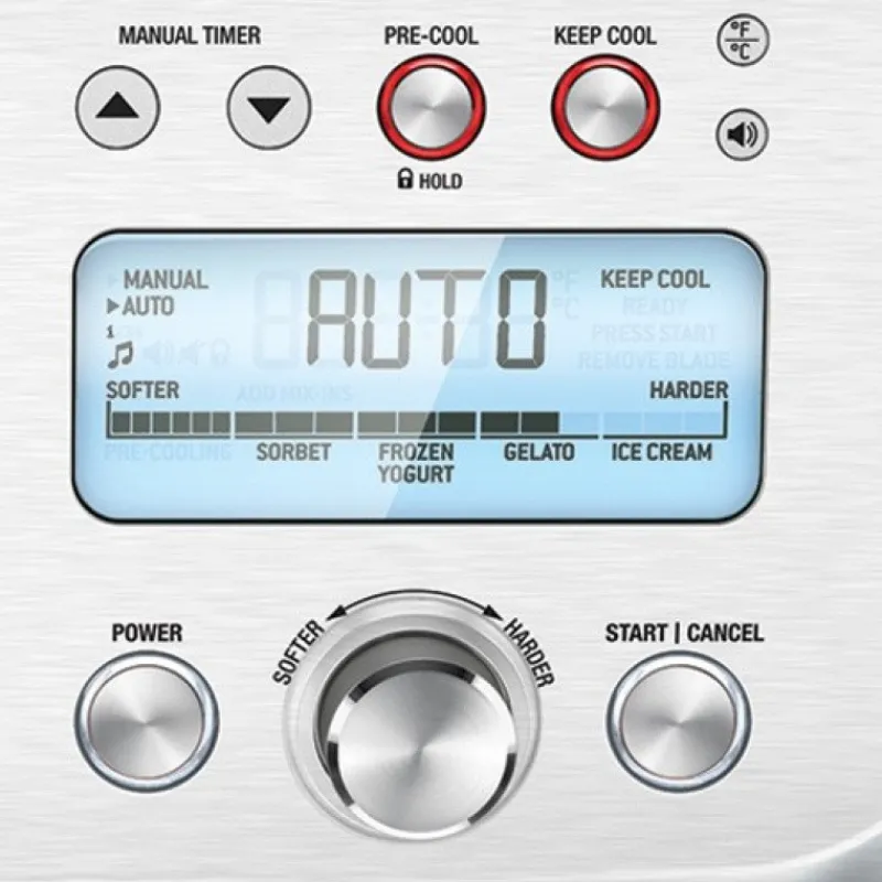 - 12 réglages de densité dont : sorbet, yaourt glacé (frozen yogurt), glace italienne (gelato) ou glace (ice cream)