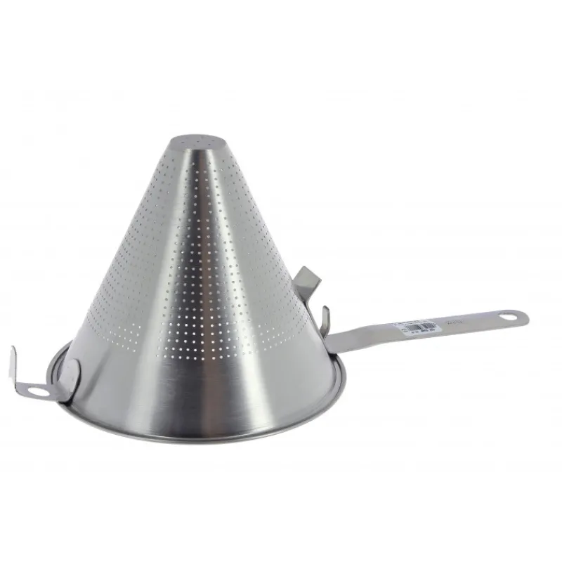 Le Passe-Sauce Ø 23 cm possède des perforations de taille standard, soit d’1,5 mm de diamètre. De petits crochets sont présents sur ce Chinois Professionnel, vous assurant une grande stabilité lorsque vous poserez votre ustensile sur un cul de poule ou une casserole.