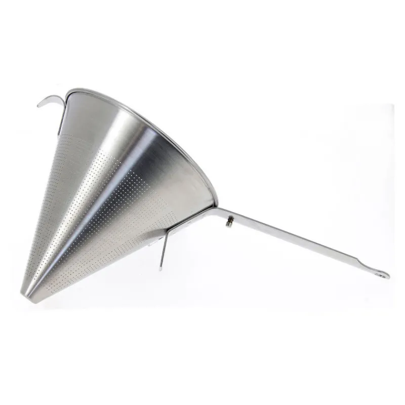 Ce chinois fabriqué en France est constitué d’acier inoxydable ce qui le rend robuste. Deux crochets et une queue en inox assure une maniabilité optimale, tandis que le trou d’accrochage facilite le rangement du chinois micro-perforé.