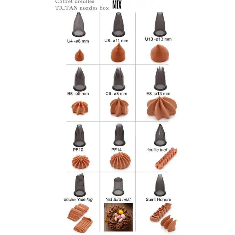 Faites le plein de Douilles à Pâtisserie avec cet Assortiment de 12 Douilles De Buyer. Vous retrouverez dans ce lot des Douilles en Tritan qui vous permettront de décorer, pocher ou encore fourrer toutes vos préparations. Douilles Cannelées, Douilles Unies, Douilles Feuilles… tant de formes différentes qui vous donneront de nouvelles idées pour sublimer toutes vos recettes.