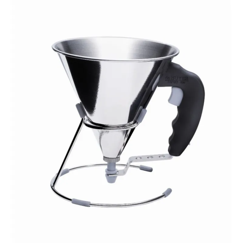Le mini entonnoir à piston automatique De Buyer s’accompagne d’un support en inox siliconé. De cette façon, ce dernier reste stable sur le plan de travail. L’intérieur de l’entonnoir en inox De Buyer est vide, facilitant ainsi le mélange si nécessaire.