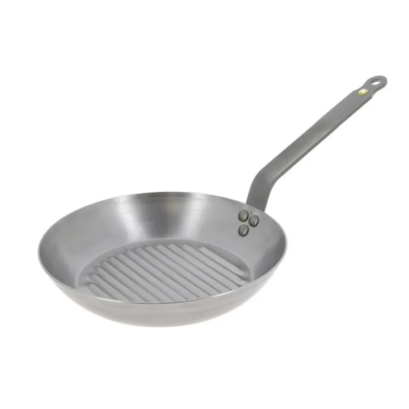 Cette poêle en acier possède une forme lyonnaise pour facilement faire glisser vos aliments dans vos plats ou assiettes, associée à un fond strié qui réduira la surface d’accroche de votre viande. Compatible tous feux, la poêle de Buyer est ainsi une poêle induction !