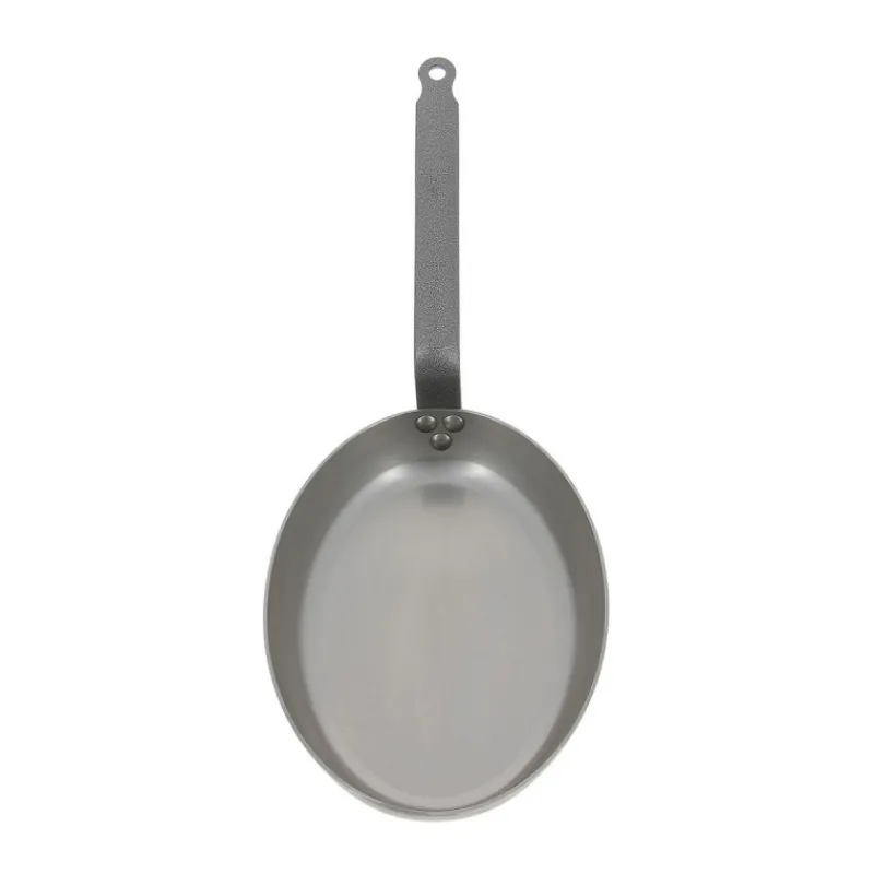 Les poêles ovales ont la forme idéale pour cuisiner les poissons entiers. A noter, ce modèle de poêle a une queue rivetée sur le grand axe.