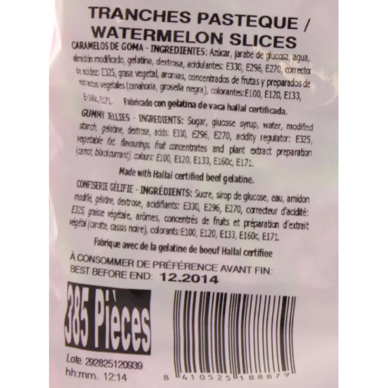 Conditionnement : sachet de 385 bonbons fini en forme de pastèque.