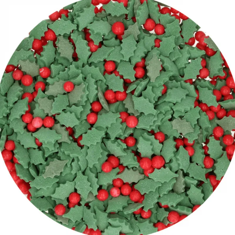 Parfaite pour parsemer vos cupcakes Noël, cette décoration comestible se compose de feuilles de houx ainsi que de baies qui rappelleront ce thème hivernal qui nous est cher. Conditionnés dans un pot refermable, ces feuilles et billes de sucre de la marque Funcakes pèse 55 g, ce qui vous permettra de le réutiliser plusieurs fois. Ce mélange sucré aux couleurs rouge et verte fait de ces décors en sucre la décoration gâteau Noël idéale.