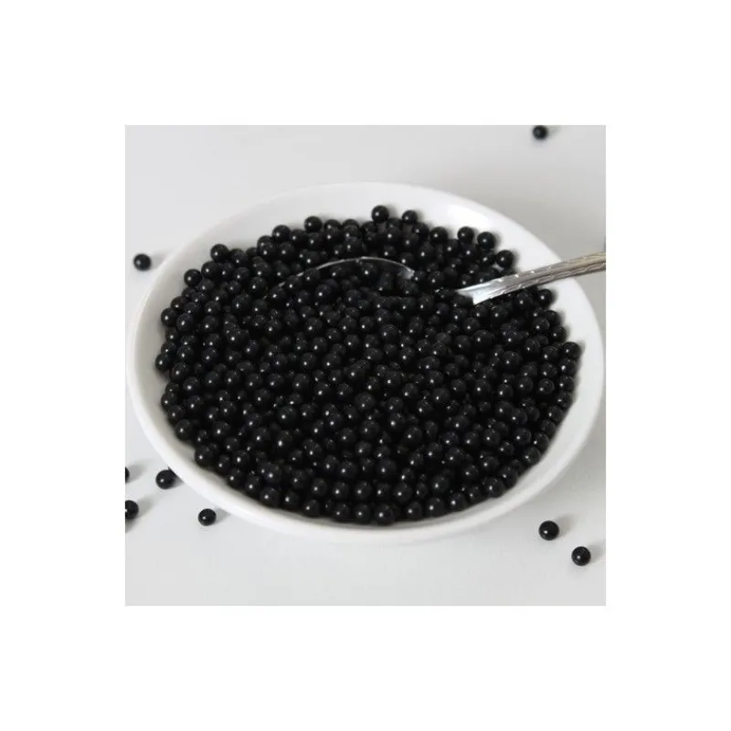 - Ingrédients : sucre, amidon (blé, maïs), sirop de glucose, colorant : E153, agent d’enrobage : E903, E904.