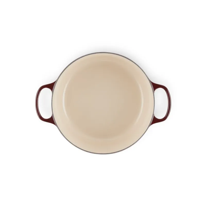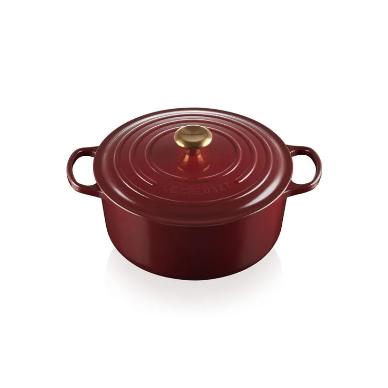 Emblème de la marque Le Creuset, produit phare conçu en France, la Cocotte en Fonte Ronde 28 cm Garnet Bouton Doré Le Creuset Signature est un véritable atout pour votre cuisine.