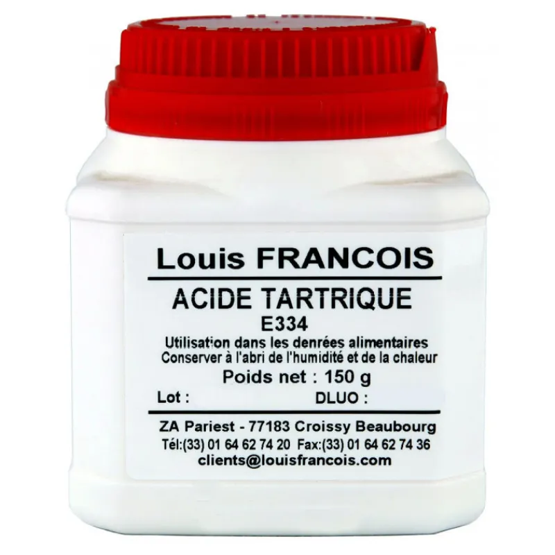 L’Acide Tartrique E334 150 g Louis François est un additif alimentaire sous forme de fine poudre au goût légèrement acidulé. Il s’utilise dans de nombreux domaines d’application tels que la confiserie, la pâtisserie, le traitement des fruits et légumes, des conserves ou encore du poisson.