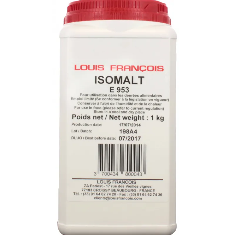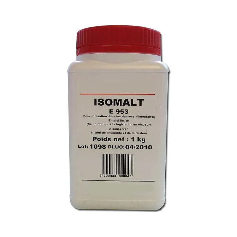 Isomalt : Poudre ou granulés blancs et inodores, de goût sucré et peu hygroscopique.