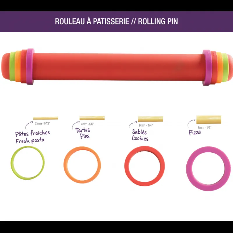 Pratique ! Voici un rouleau à pâtisserie ajustable. Grâce à 4 paires d’anneaux, vous allez pouvoir choisir l’épaisseur de pâte voulu. Il suffit de fixer de chaque côté du rouleau la paire d’anneaux de la hauteur voulu. Ainsi pour les pâtes fraîches, prenez les plus petits anneaux pour obtenir une pâte de 2mm d’épaisseur. Pour les cookies, obtez plutôt pour une épaisseur de 4 mm, pour la pâte à tarte 6mm et pour de bonnes pâtes à pizza l’épaisseur 8 mm sera parfaite.