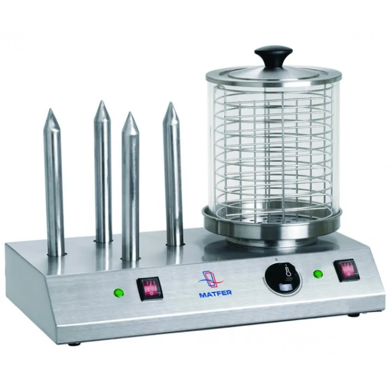 La Machine à Hot Dog se compose de 4 plots chauffants afin de garder le pain chaud. A côté se trouve un manchon mesurant 200 mm de diamètre et 240 mm de haut. Il contient un panier en inox qui peut contenir 40 saucisses au total. La machine à hot dog possède un couvercle et un bac à eau en inox. Le thermostat de la machine à hot dog permet de régler la température avec précision.