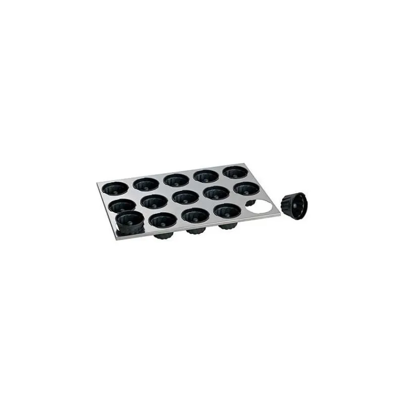 Plaque 15 moules à kouglof Exoglass® Ø 9,5 cm montés sur une plaque en acier inoxydable. Facilite la manipulation des moules lors du remplissage et de la cuisson. Moules amovible pour le lavage. Verrouillage sur plaque par vissage 1/4 de tour.
