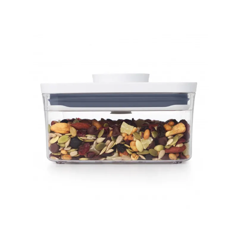 D’une petite contenance, la boîte de conservation Oxo est idéale pour les cacahuètes, les pistaches ou les fonds de paquets de pâtes ou de riz. Pratique et efficace, la boîte hermétique carrée se fera rapidement une place de choix dans vos placards !
