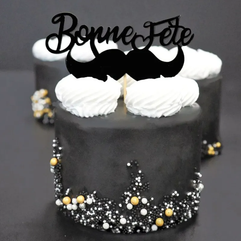 Souhaitez une bonne fête à votre père avec une touche d’humour grâce au décor bonne fête moustache Patisdécor. Ce « bonne fête » calligraphié est accompagnée d’une élégante moustache qui, nous en sommes sûrs, donnera lieu à bien des calembours.