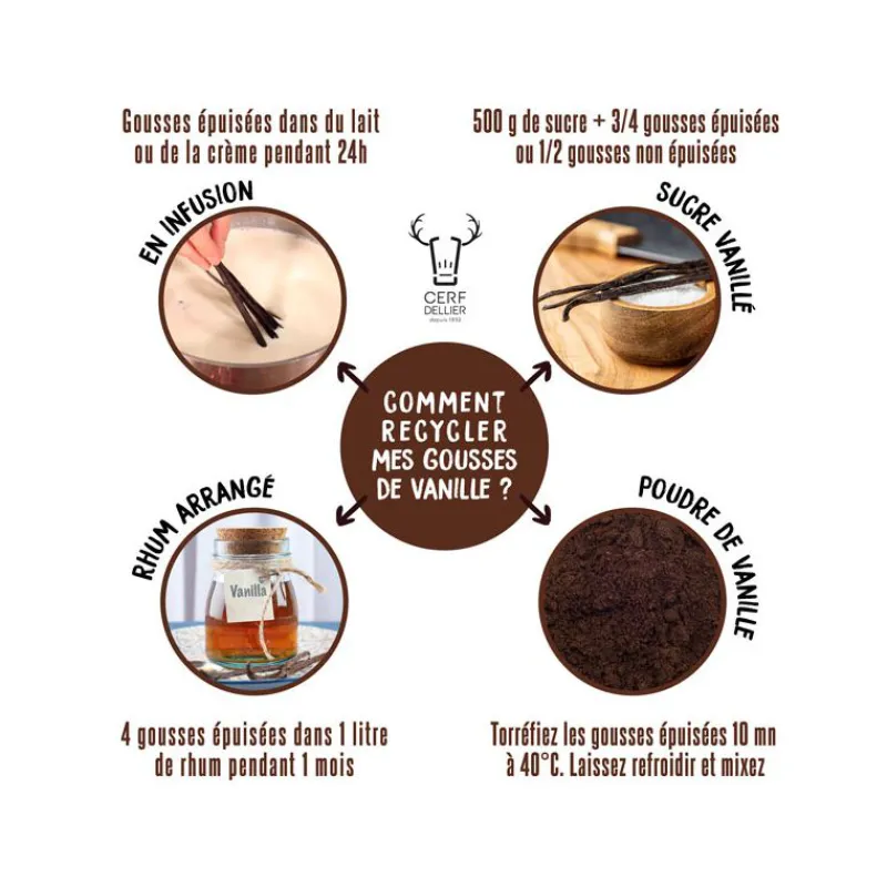 Une fois votre vanille en gousse utilisée, ne la jetez pas, les gousses Patisdécor peuvent encore servir de nombreuses façons. Vous pouvez par exemple les laisser infuser dans du lait, ou encore les torréfier avant de les mixer.