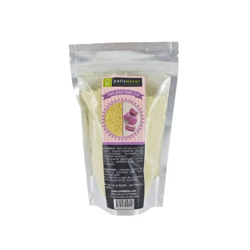 Ce Tant pour tant est un mélange composé à 50% de sucre et à 50% de poudre d’amande. Avec ce Tant pour tant Sucre/Amande, réalisez et réussissez de délicieux macarons. Vous pouvez aussi l’utiliser dans la confection de crème d’amande.