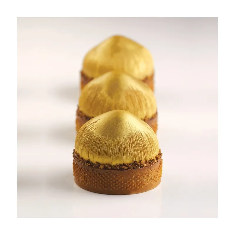 Ce Moule Silicone Professionnel permet un démoulage sans accroche pour un résultat parfait. Formez vos fonds de tartelette avec un cercle à tarte Ø 6 cm. Garnissez-les. Puis déposez-y votre délicieux décor de tarte à la forme de noisette. Enfin, apportez la touche finale avec de la poudre or.
