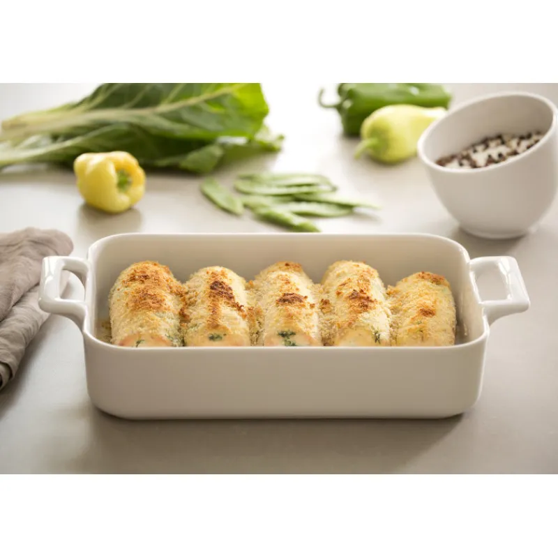 Le plat rectangulaire Revol de Belle Cuisine est muni de 2 anses issues du même bloc que le corps du plat pour assurer une solidité exceptionnelle et une manipulation facile.