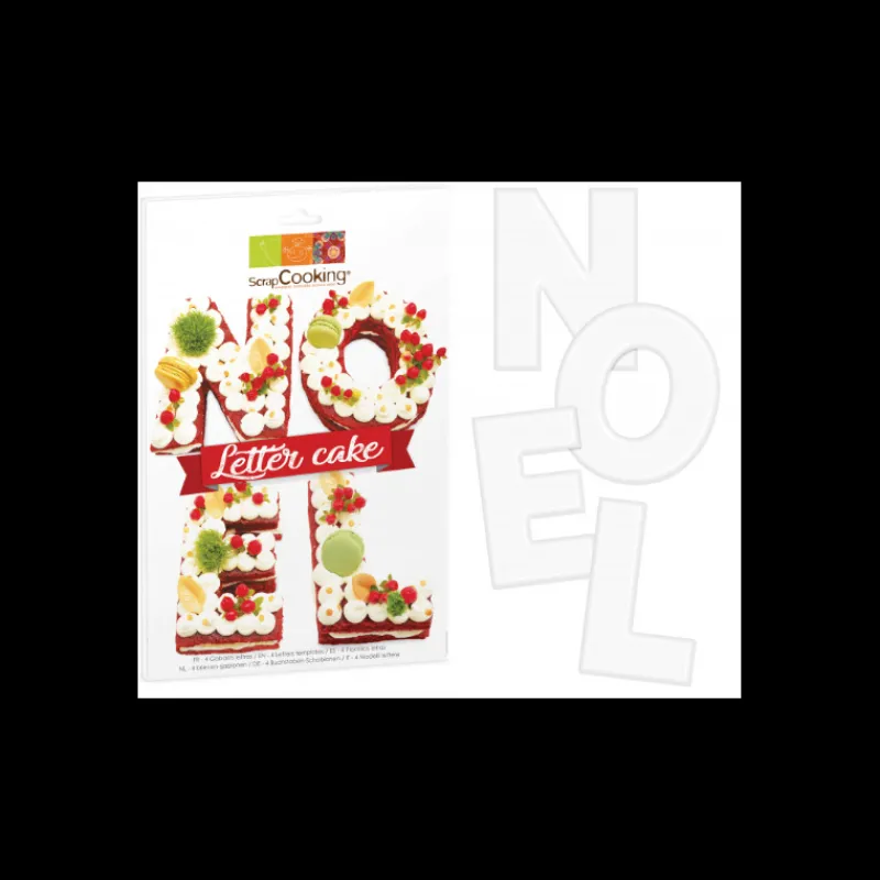 Envie d’innover cette année pour le gâteau de Noël? Cassez les codes de la traditionnelle bûche de Noël et réalisez un Letter Cake Noël. Gâteau tendance, à l’instar du Number Cake, le gâteau lettre est un dessert composé de deux biscuits (sablé, dacquoise, génoise…), d’une crème montée (chantilly, crème pâtissière, …) et agrémenté de décors en tout genre (macarons, chocolats, fleurs…). Sa spécificité ? Il est composé des lettres N-O-Ë-L. Pour découper ces lettres en toute simplicité, le Kit Letter Cake Noël Scrapcooking est composé de 4 gabarits réutilisables en plastique.