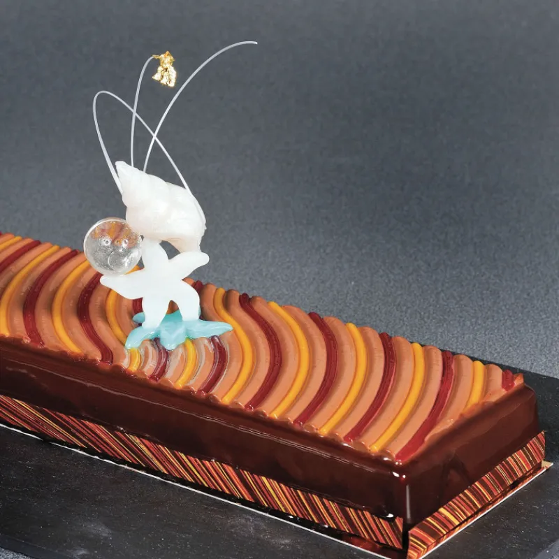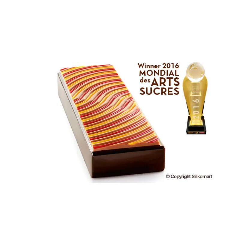 Envie d’un entremets plein d’élégance ? Avec le Moule Chant des Sirène rien de plus simple : le kit comprend un moule en silicone rectangle de 1085 ml, pouvant être déposé dans un support rigide en plastique inclus, et un tapis de texture en silicone. Le tapis en silicone peut contenir 215 ml de préparation et vous permettra d’habiller le dessus de votre dessert avec de petites ondulations.