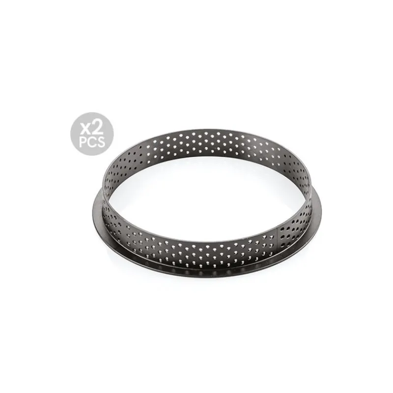 La tarte est le dessert traditionnel qui met tout le monde d’accord ! Qu’elle soit salée ou sucrée, les saveurs de la tarte sont multipliées pour donner un dessert ou un repas croustillant, fondant et surtout gourmand. Si vous êtes créatif et que vous souhaitez revisiter vos tartes signatures, il est temps d’utiliser le Kit Moule Silicone 2 Tartes Ø 120mm Silikomart. A l’intérieur, on y trouve 2 cercles perforés de 120 mm de diamètre composés de matière thermoplastique indéformable. Ces cercles pâtisserie sont indispensables pour préparer votre base de pâte sablée qui soutiendra la garniture de votre choix. Perforés, les cercles à tarte offrent à votre réalisation une cuisson très homogène. Ces deux accessoires de cuisine sont livrés avec un moule silicone à deux empreintes, ce qui vous donne l’opportunité de créer deux tartes à partager en duo. Ces moules à tarte sont parfaits pour réaliser une mousse ou un crémeux à poser délicatement sur votre base. Ainsi, au moment de la dégustation, un mélange de savoureuses textures vous émerveillera.