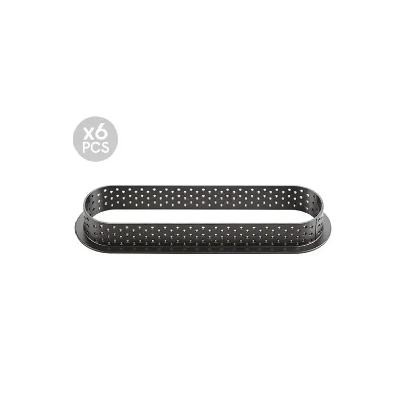 Si vous souhaitiez réaliser de superbes tartelettes oblong, le Kit Moule Silicone 6 Tartelettes Oblong 146mm Silikomart Professional est fait pour vous ! Composé d’un moule silicone à 6 empreintes de tarte individuelle et de 6 cadres perforés de 14,6 cm, ce kit pâtisserie vous accompagnera en cuisine. Cette forme oblong que vous connaissez grâce aux célèbres pâtisseries éclairs est unique et originale ! Votre garniture sera réalisée à l’aide du moule silicone qui est aisément démoulée et lavable. Quant à votre base croustillante, elle sera reproduite grâce au cadre oblong perforé. Muni de petits orifices, ce cadre à tartelettes est idéal pour laisser la chaleur se diffuser lors de la cuisson et garantir une homogénéité sur l’entièreté de votre gâteau.