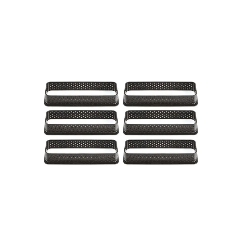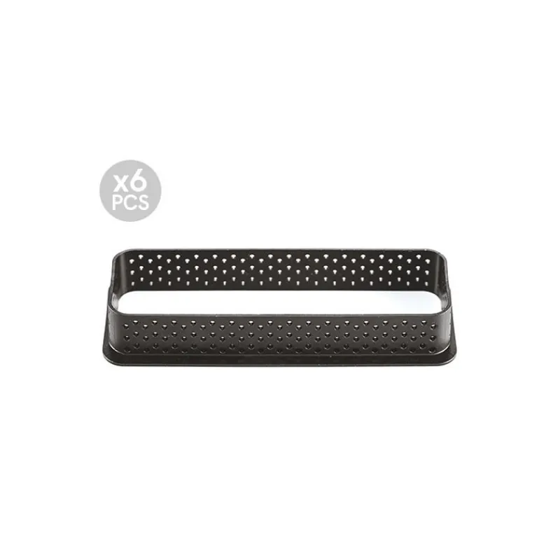 Pâtissiers et pâtissières, à vos fourneaux ! Réalisez de superbes tartelettes rectangulaires grâce au Kit Moule Rectangle Silicone 6 Tartelettes 12 cm. Ce moule rectangulaire est l’accessoire de pâtisserie qu’il vous faut puisqu’il résiste au vieillissement et sa matière anti-adhésive lui octroie une certaine souplesse ! Les grands pâtissiers sont friands de ce moule tartelette que vous avez déjà probablement vu dans une émission culinaire. Sa facilité d’utilisation, son originalité et son élégance en font un accessoire redoutable pour proposer des desserts très visuels. Alors, procurez-vous ce Kit Pâtisserie comprenant un moule silicone de 6 empreintes de 26 ml et 6 cadres rectangulaires perforés de 12 cm ! Les cadres rectangulaires ont l’avantage de posséder des petits trous qui libèrent et diffusent la chaleur sur votre réalisation, ainsi, une cuisson homogène est permise.