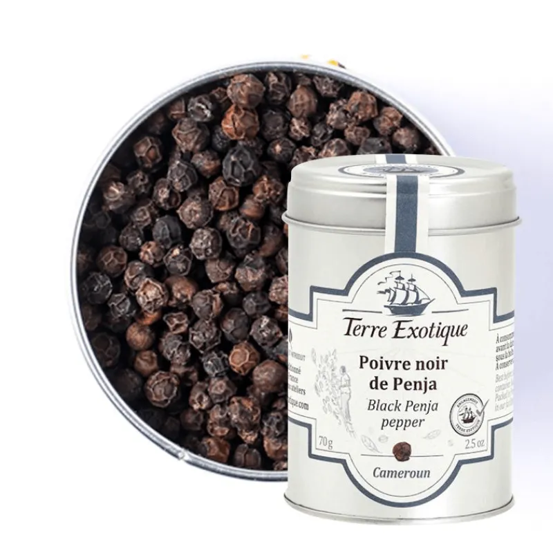 Le Poivre Noir de Penja 70 g Terre Exotique incarne l’essence même du caractère et de l’authenticité. Cette épice d’exception est reconnue pour sa qualité supérieure avec une Indication Géographique Protégée (IGP) qui atteste de son origine et de ses saveurs uniques. Issu de la famille du Piper nigrum, ce poivre noir est cultivé avec passion et récolté à la main au Cameroun, dans la région de Penja.