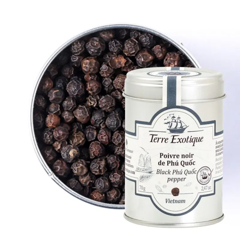 Découvrez le Poivre Noir de Phú Quoc 70 g Terre Exotique, le condiment parfait pour des repas fort en assaisonnement.