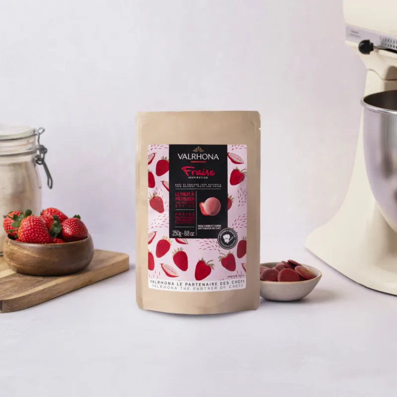 Vous aimez cuisiner le chocolat ? Vous adorez la fraise ? Alors vous êtes au bon endroit ! Découvrez une innovation Valrhona: un fruit naturel qui se pâtisse aussi bien que les pistoles de chocolat. Ainsi, nous vous invitons à libérer votre créativité en cuisinant ces pistoles de fraise à la couleur et au goût 100% naturels, issues d’un assemblage complexe de fraises, de beurre de cacao et de sucre.