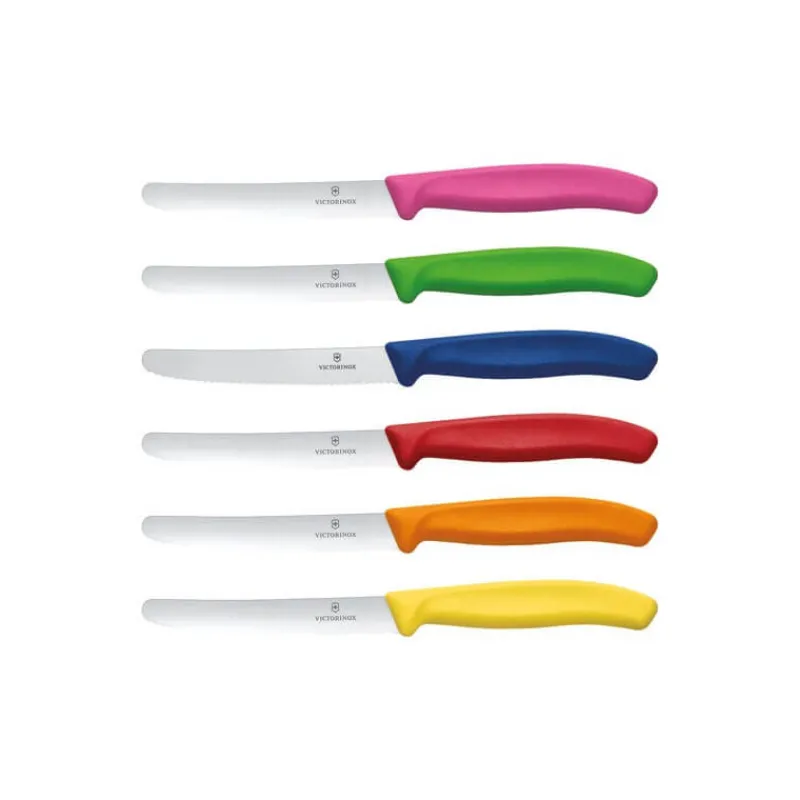 Que ce soit simplement pour manger, ou bien pour confectionner de délicieux repas, ces couteaux en inox et leur lame de 11 cm sont l’instrument idéal ! De plus, chaque couteau de ce lot possède un manche en polypropylène de couleur différente : rouge, orange, jaune, vert, bleu, et rose. Ces couleurs seront une touche de vivacité certaine lors de vos repas. Pour plus de sécurité, les couteaux de table Victorinox ont un bout rond. Les enfants pourront donc s’en servir à moindre risque.
