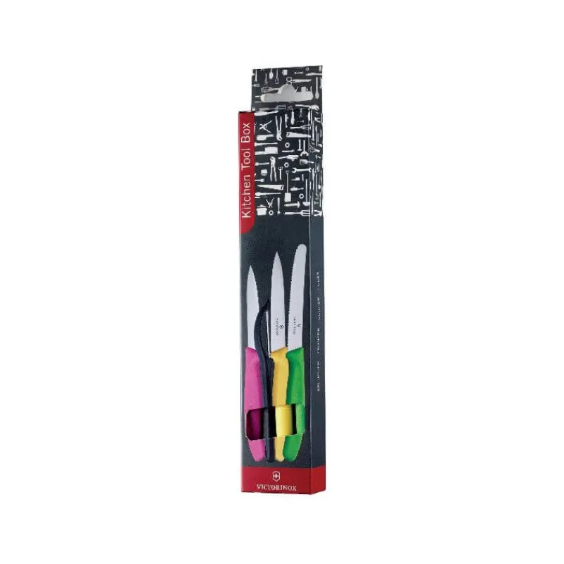 Complétez votre panoplie de couteaux par un set de qualité professionnelle. Que vous soyez amateur ou professionnel, le lot de couteaux d’office et épluche légumes Victorinox vous sera très utile. Ce set contient deux couteaux d’office à la lame lisse parfaits pour dénoyauter, détailler, ou égrainer fruits et légumes, un couteau de table avec une lame dentelée, et un épluche légumes avec une lame à double tranchant.