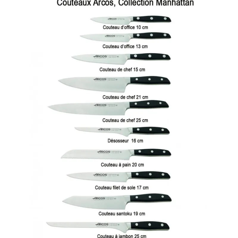 Inspiré de la coutellerie japonaise, le Couteau Santoku Arcos MANHATTAN se distingue par une large lame rigide qui se termine par un angle aigu, contre un angle obtu pour le simple couteau santoku. Cette particularité lui permet d’opérer un mouvement de balancier extrêmement fluide, pour une découpe nette, précise et rapide. Si le couteau santoku Arcos MANHATTAN peut impressionner par ses dimensions, il se révèle très facile à manipuler. En effet, il vous permettra de couper des pièces de viande importantes, d’émincer des légumes ou de hacher finement des herbes. Loin d’être réservé aux professionnels, le couteau santoku Arcos MANHATTAN s’adresse également aux particuliers.
