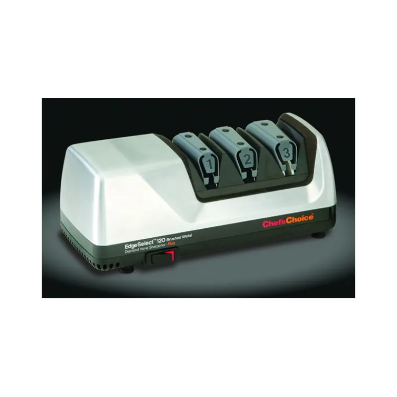 Aiguiseur électrique CC 120 Chef’s Choice professionnel pour utilisation régulière. Il permet d’affûter les couteaux à lame lisse et à lame crantée.