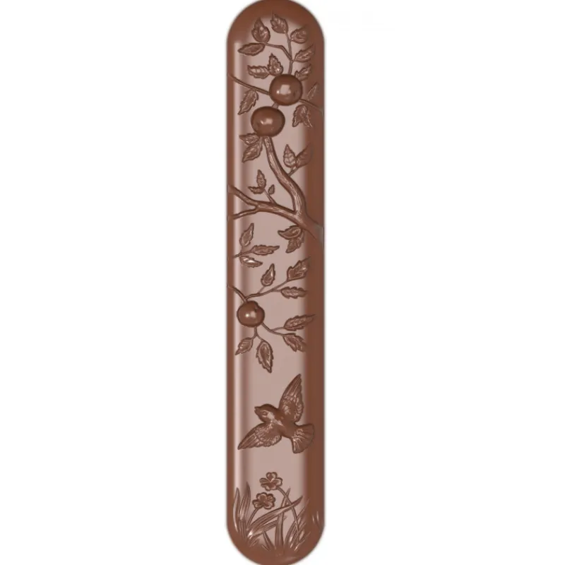 Ornez vos éclairs d’une élégante barre de chocolat réalisée à l’aide du Moule Chocolat Barre pour Eclair Chocolate World. Celle-ci est ornée d’un motif Belle Epoque avec des branches juste fleuries, des fleurs et un oiseau. La barre de chocolat apporte une finition plus soignée que le glaçage, ainsi que du croquant à une pâtisserie où le moelleux et le fondant domine généralement.
