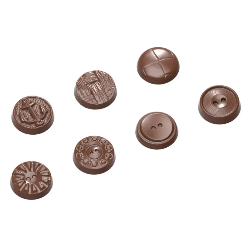 Créez des décors en chocolat orignaux à l’aide de ce Moule à Chocolat Boutons Chocolate World. La plaque à chocolat est faite à 100% de polycarbonate et présente 21 empreintes en forme de boutons de 7 motifs différents.