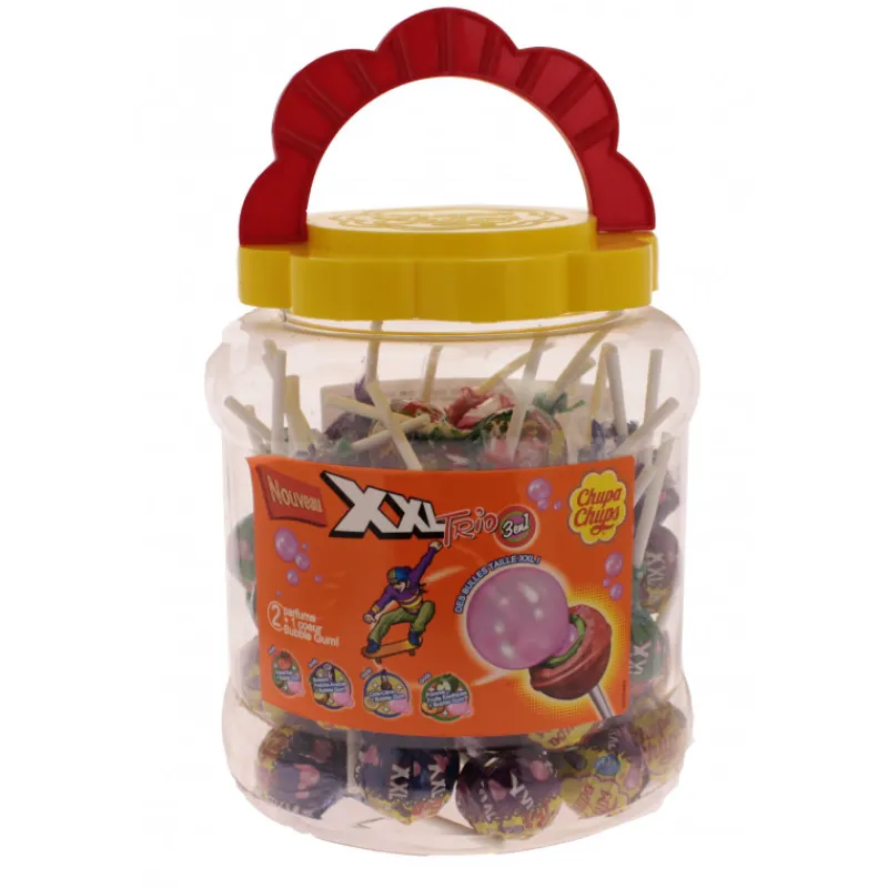 Laissez-vous tenter par les Sucettes Chupa Chups XXL ! Cette boite refermable et réutilisable Chupa Chups contient 60 sucettes XXL Trio ! Chaque sucette XXL renferme deux parfums et un coeur en bubble gum !