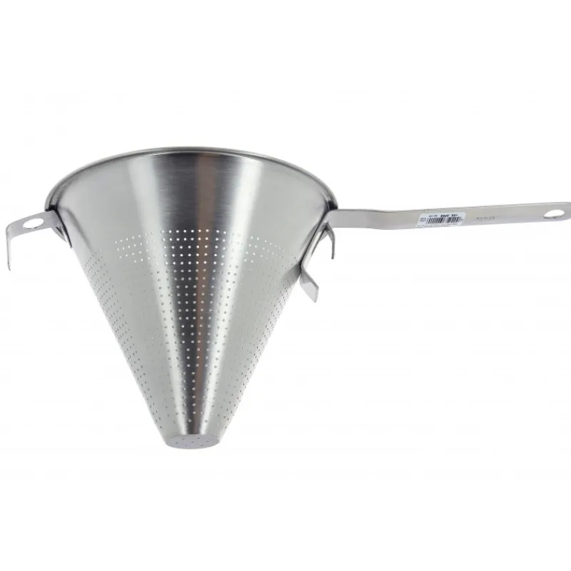 Le Passe-Sauce Ø 23 cm possède des perforations de taille standard, soit d’1,5 mm de diamètre. De petits crochets sont présents sur ce Chinois Professionnel, vous assurant une grande stabilité lorsque vous poserez votre ustensile sur un cul de poule ou une casserole.