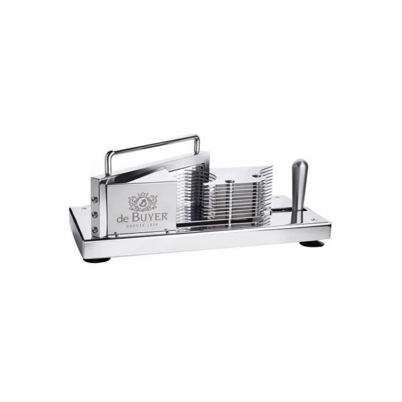 Le tranche tomate professionnel de la marque De Buyer permet un tranchage précis en fines rondelles de toutes les tomates, mûres ou fermes, en quelques secondes et en toute sécurité. Un chariot vous permet de précipiter la tomates sur une grille composée de 10 lames qui couperont votre tomates en 10 tranches fines. La main n’est, à aucun moment, en contact avec la tomate durant coupe, car le chariot est accompagné d’une poignée pour une découpe en toute sécurité.