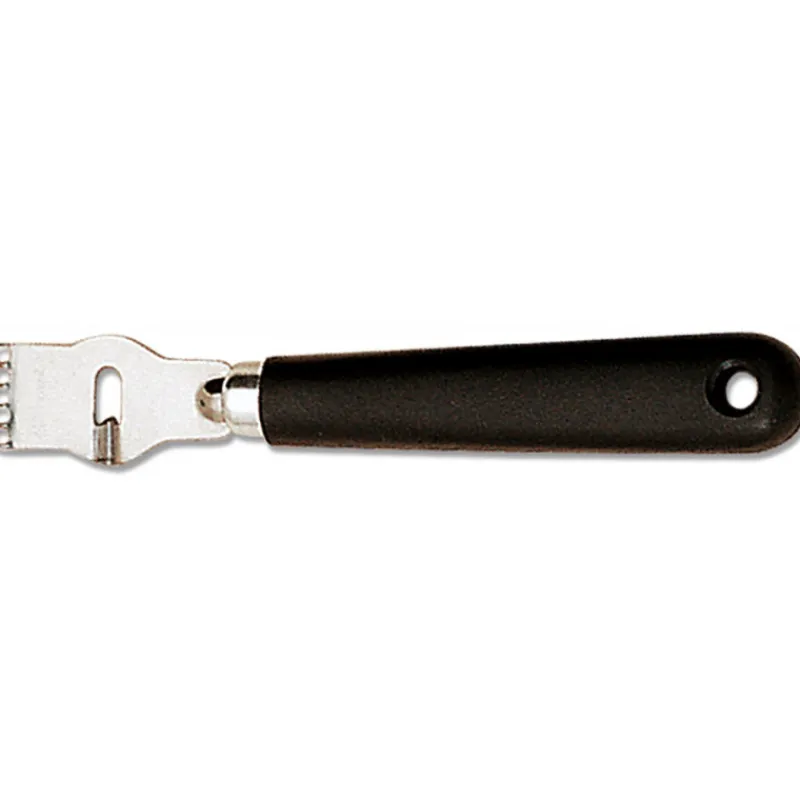 Deux fonctions pour cet ustensiles de cuisine (Décozest) : le canneleur pour décorer agrumes, légumes… et le zesteur, petite râpe qui permet d’obtenir des bandes très fines de la peau d’un fruit appeler « zest » qui serviront à parfumer sauces, boissons… Le zesteur canneleur pour droitier de la marque Deglon présente une virole en acier inoxydable.
