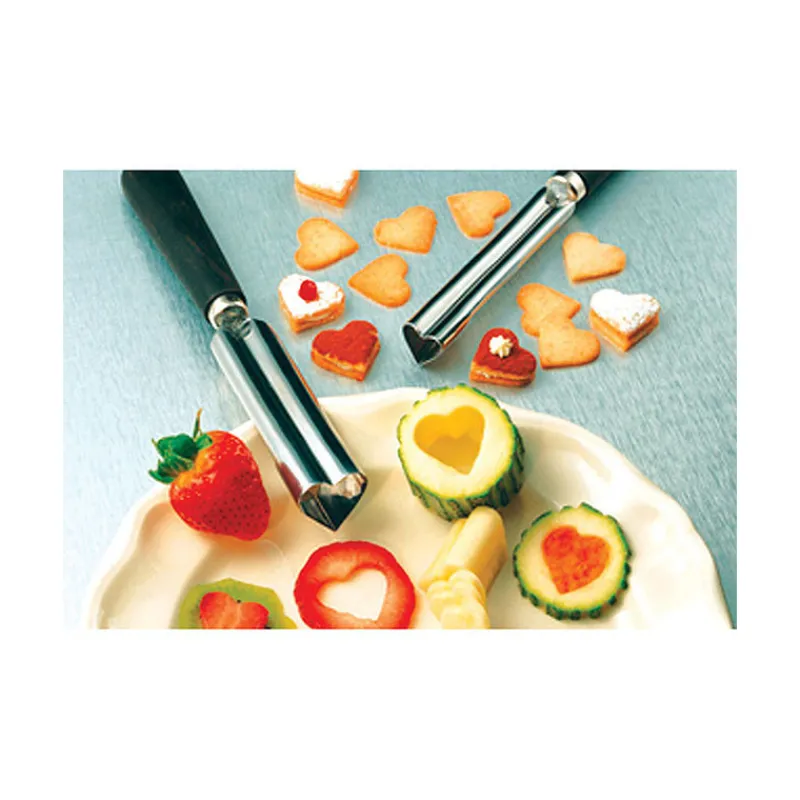 L’emporte Coeur permet de creuser des fruits et légumes pour obtenir une forme de coeur. L’emporte coeur peut également être utilisé sur des pâtes ou gâteaux.