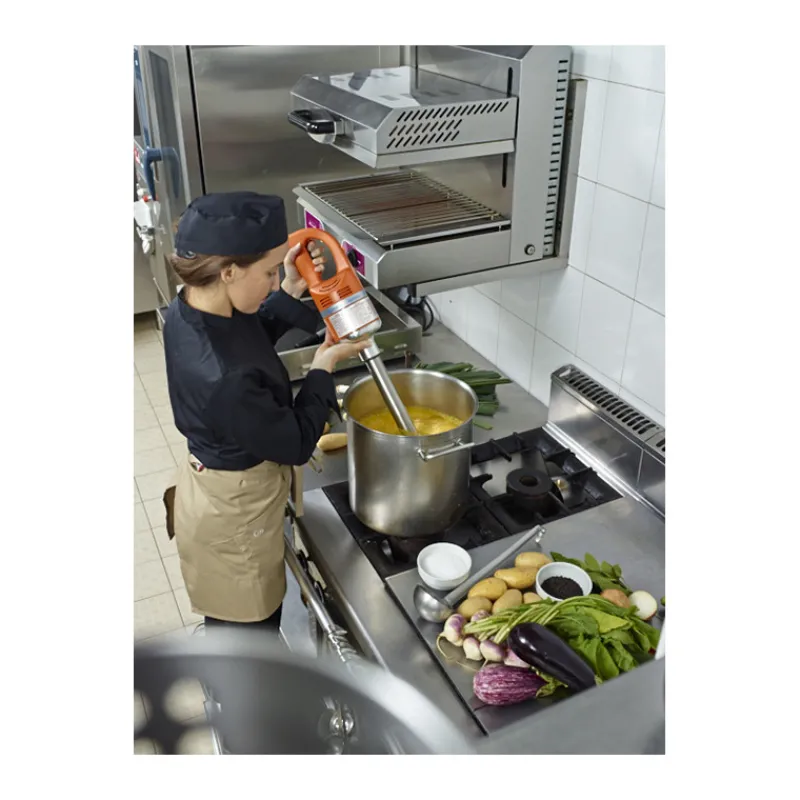 Le mixeur plongeant batteur Master Combi 410.H Dynamic dispose de deux micro interrupteurs : l’un de sécurité, l’autre pour la fonction continu. Le variateur de vitesse permet d’obtenir une texture plus ou moins fine selon la préparation voulue. Le mixeur plongeant batteur Master Combi 410.H Dynamic se pare d’un indicateur lumineux de mise sous tension, pour une utilisation en toute sécurité. Le pied, le couteau et la boite fouet sont faciles à démonter afin que l’entretien se fasse tout aussi facilement et rapidement. Le tube de plongée, la cloche et les fouets du mixeur plongeant batteur Master Combi 410.H Dynamic sont en acier inoxydable.