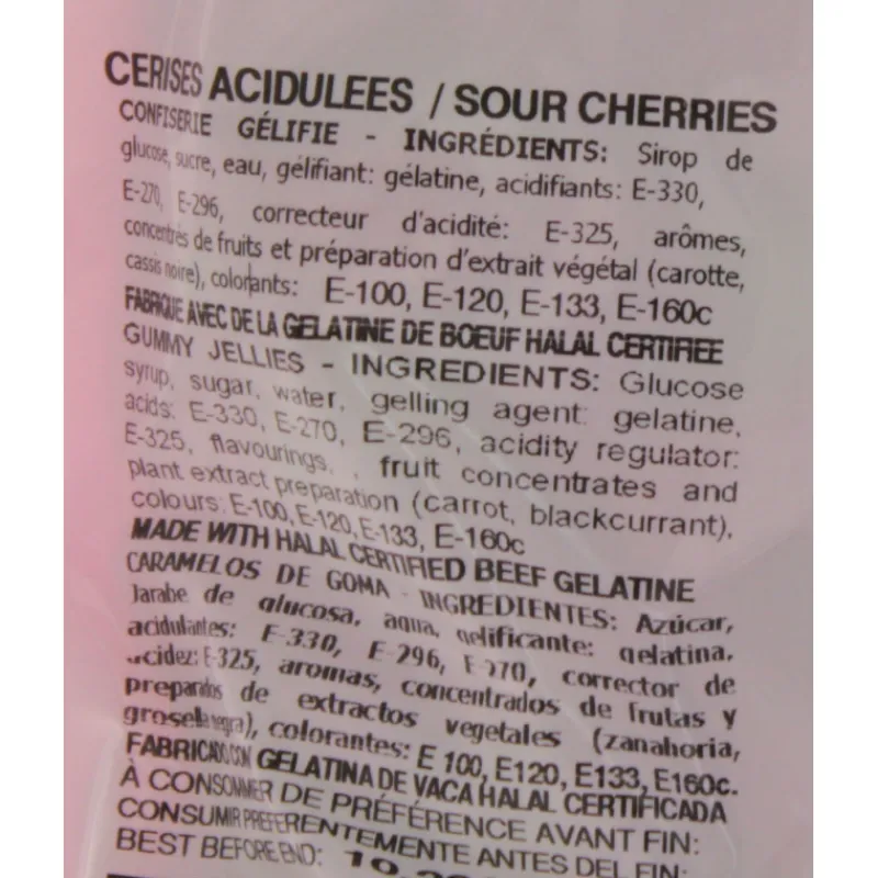 Conditionnement : sachet de 385 bonbons de cerises acidulées.