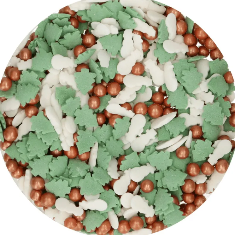 Parsemez ainsi le glaçage de vos biscuits Noël avec cette décoration comestible aux couleurs festives et plongez dans la magie de Noël avec ces 65 g de décoration gâteau. Ces décors en sucre se caractérisent par un mélange de formes comprenant, sapin, bonhomme de neige et billes de sucre dorées qui apporteront relief et croquant à vos pâtisseries. Saupoudrez vos cupcakes Noël avec ces décorations en sucre de la marque Funcakes et dégustez vos créations gourmandes et réconfortantes.