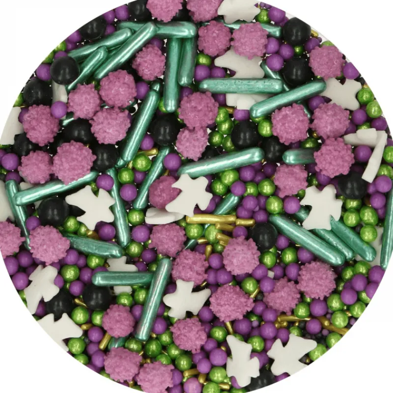 Ce mélange Halloween se compose de divers décors en sucre comme des fantômes et billes à picots. Vous apercevrez également des bâtonnets et billes en sucre parée d’une teinte verte métallique pour ajouter une dose de fun supplémentaire à cette fête effrayante…
