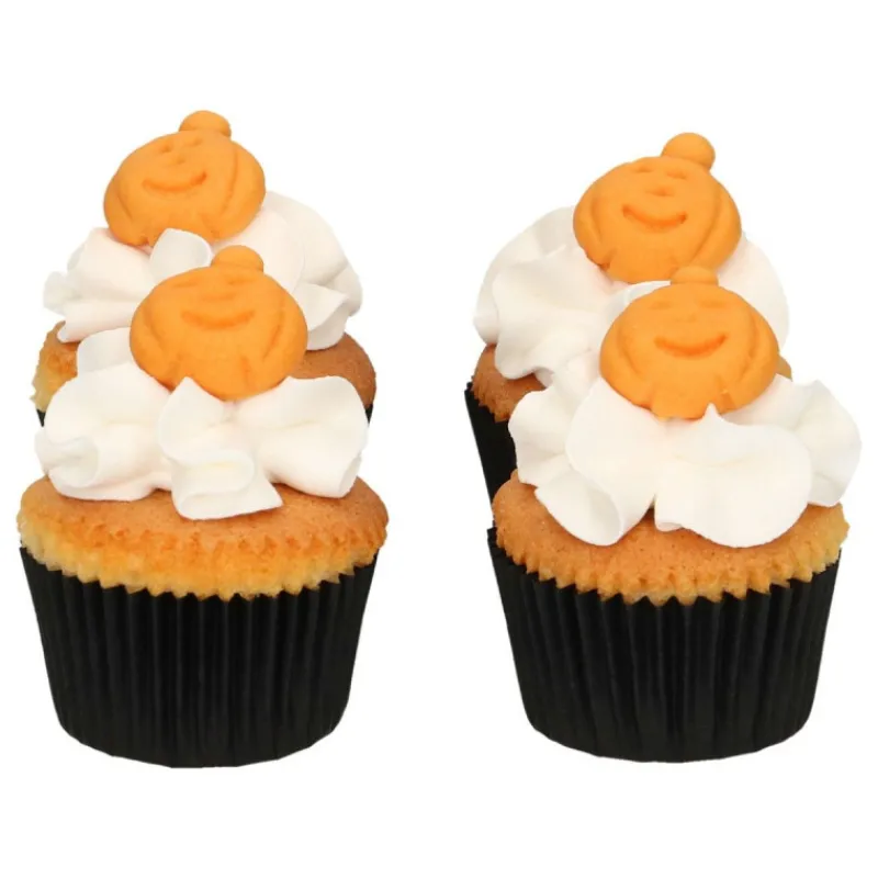 Réalisées en pâte à sucre, ces citrouilles oranges immergeront vos plus beaux desserts dans l’ambiance particulière d’Halloween où les fantômes ne pensent qu’à une seule chose…dérober vos précieux bonbons, si bien qu’ils en oublieraient de jeter des sorts.